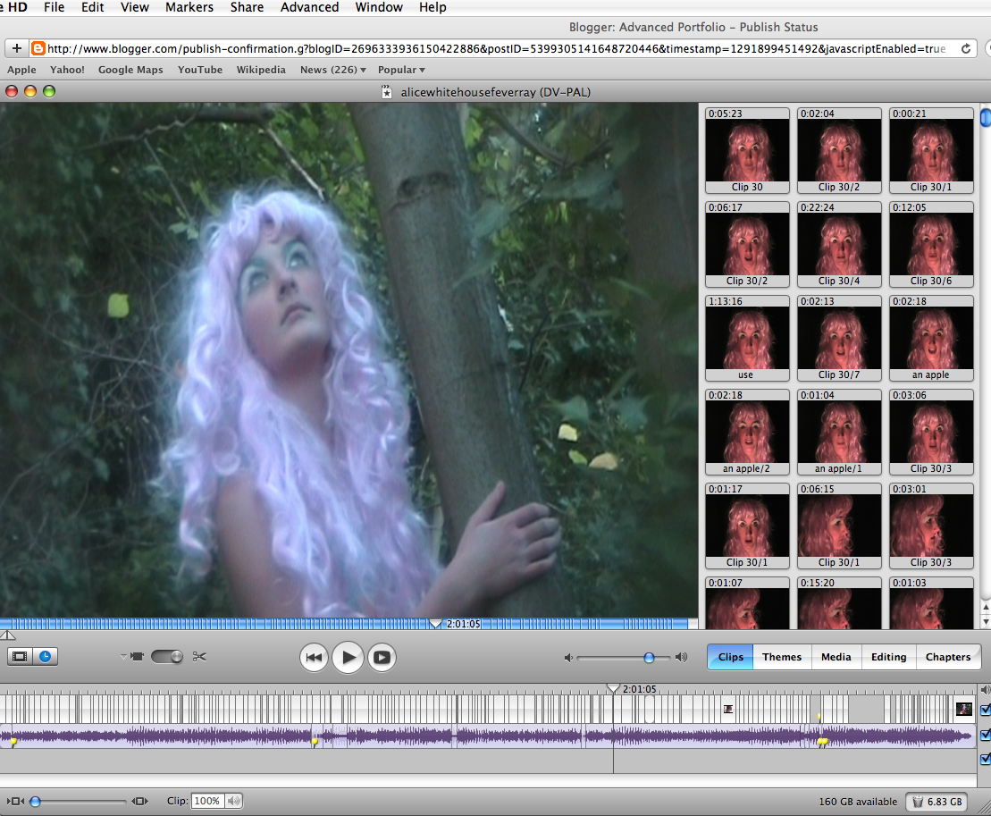 This is the last part before she appears in the wardrobe. We didn't add any effects here. It was difficult timing the end of the woods scenes to flow into the garage scenes. We have previously edited the garage scenes and whenever we edited the wood scenes, IMovie always moved the garage scene footage. We had to place the beginning of the garage scene at a presise time -2.03 (as stated in the storyboard) and thenmake sure that the footage prior to this isn't to short or too long. I managed to conquer this problem.